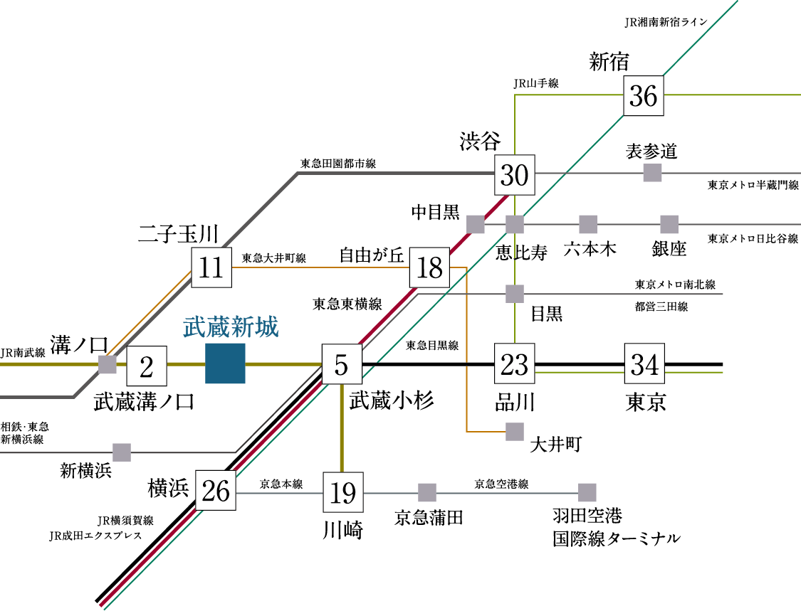 2023年に開通した東急新横浜線を利用すると「武蔵新城」駅から「新横浜」駅まで20分でアクセスが可能です。「新横浜」駅から東海道新幹線を利用すれば旅行やレジャーはもちろんビジネスシーンでも活用が可能です。